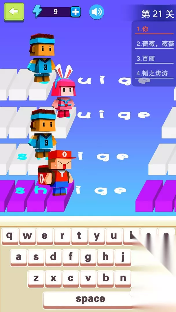 玩家可以解锁十分可爱的方块小人和自己一起闯关,小形象的设计也使游戏增添了更多趣味的属性。关卡中会跳出不同的汉字,根据它的偏旁和部首需要选择正确的输入方式才能够打出最终的汉字。与其他的玩家pk时,将会激起更多玩家的挑战欲望,打字的速度越快,获得的金币和奖励就会越多。 高速下载 普通下载 优先233乐园APP下载 3、《打字我最溜》