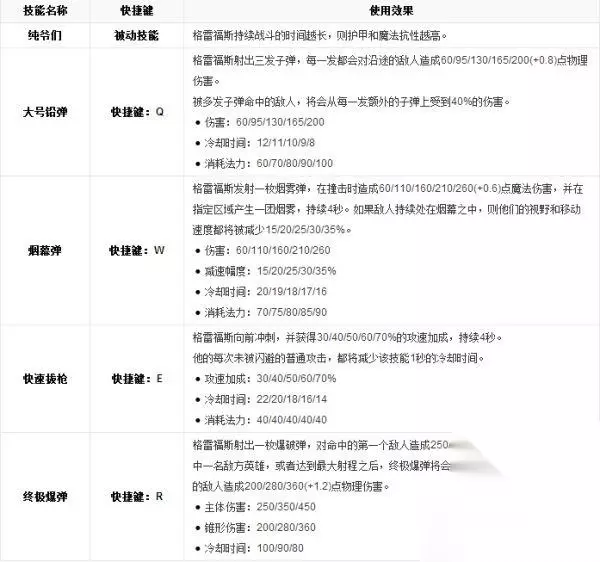 英雄属性 生命值:410(+84/每级) 魔法值:304(+40/每级) 基础攻击力:54 移动速度:330 攻击速度:0.625 护甲值:19(+3.2/每级) 魔法抗性:30(+0/每级) 攻击距离:525 生命回复:5.5(+0.7/每级) 魔法回复:6.75(+0.7/每级) 使用技巧 当你使用法外狂徒 【W烟幕弹】既可以用来逃命,也可以用来杀人。 可以用【E快速拔】来接近敌人,然后用【Q大号】来造成巨额的伤害。 敌人使用法外狂徒 格雷福斯主要造成物理伤害,所以护甲是一个非常有效的反制手段。 离开烟幕弹的作用范围,能使烟幕弹作用于你的有害效果立刻消失。