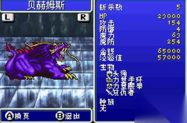 贝赫姆斯 《最终幻想4》最让人讨厌的小BOSS之一,看似是个随机遭遇的杂兵,实际是固定地点遇敌的小BOSS,最初遭遇是在收巴哈姆特的幻兽洞穴,之后还会在各种迷宫路口遇到它。