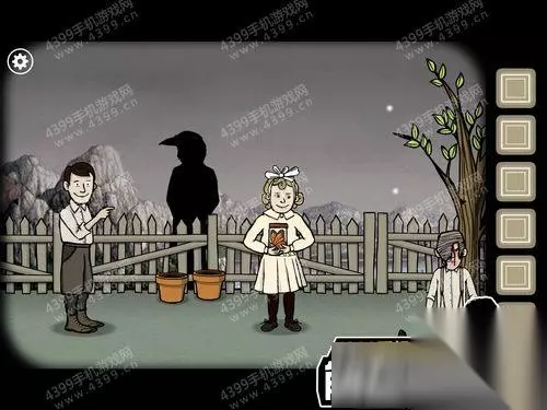 9、再次控制左边的男孩用弹弓打树上的蜜蜂窝,蜜蜂窝落下之后掉到右边的男孩头上,点击右边的男孩,画风突变,中间又一次出现乌鸦头的人,说了几句话之后本关结束;