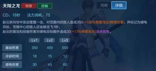 赵云的二技能是赵云唯一的回复技能。 技能释放需要1秒左右的时间,在此期间无法移动,可以通过位移技能或闪现打断。 攻击命中多个目标或一个目标回复效果相同。 后期配合冷却缩减能够做到一技能和二技能几乎无缝衔接使用。 三技能:天翔之龙