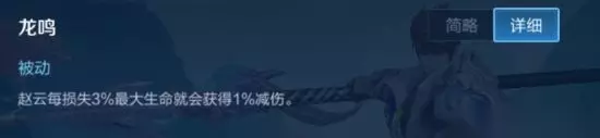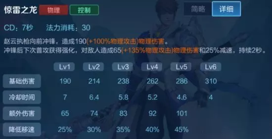 赵云的被动技能是赵云生存能力的保证,但最多33%的减伤也并不能让赵云足够的肉,所以赵云还是需要出一些防御装强化自身身板的。 被动技能的减伤能让赵云血越少越硬,容易让对手出现伤害计算错误,导致一套技能没有秒掉赵云,所以在玩赵云时,如果发现自己血量不多了,但是能一套技能带走对方的时候,可以勇敢的去回头反打,经常会有奇效出现。 一技能:惊雷之龙