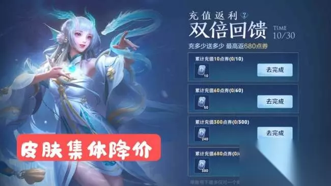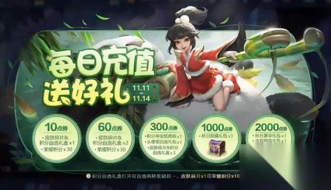 【充值返利】 还有就是充值返利活动,每次出新皮肤都会有这个充值返利活动,这次孙尚香的新皮肤出来也不例外。这次的充值返利活动还是和以前的一样,可以获得很多皮肤碎片和荣耀积分以及积分夺宝券。对于想要白嫖荣耀水晶的玩家来说,充值返利是必不可少的。