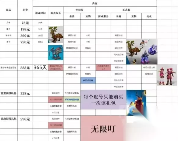 二、正式服叮号礼包介绍 75块钱啥都不送 192季卡送木头龙 360半年卡送木头龙母子 720年卡送木头龙母子+翡翠龙+小金鱼 888是年卡+年卡奖励+80级丁 328是一次性限购的80丁+角鹰兽 298是无限次数的80丁但是没有角鹰兽