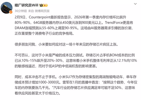 今日,存储芯片价格暴涨已成行业焦点。据Counterpoint最新数据,2026年一季度内存价格环比飙升80%-90%,64GB服务器内存单价从450美元跃至9…