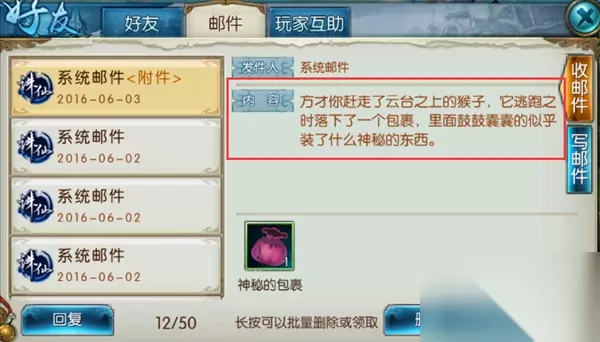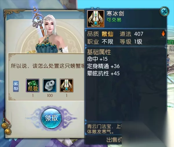 3.寒冰剑: 任务地点:青云山(青云) 在NPC“萧逸才”所在位置外圈找到被包袱的猴子,打死猴子之后会收到一封邮件,获得包裹,之后一直自动寻路即可,获得大闸蟹后,选择将它交还给龙王,即可获得:寒冰剑。