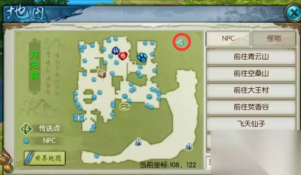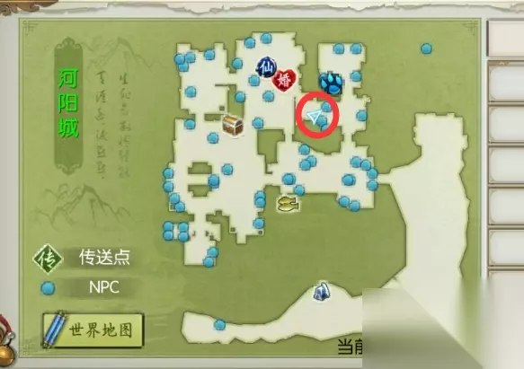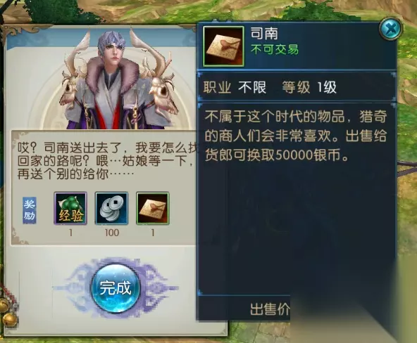 5.司南: 任务地点:河阳城(初始主城) 使用御剑飞行能力,飞到如图位置的小岛上,触发任务,需要回到城内为NPC购买烧鸡。带回烧鸡后即可获得:司南