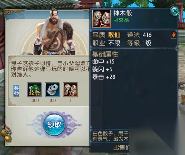 6.神木骰: 在如图位置,使用御剑飞行能力,一直往上飞,可以看到一个站在葫芦上的人,对话后触发任务,需要帮他不停的跑腿购买东西等,一直自动寻路即可,最后可以获得:神木骰