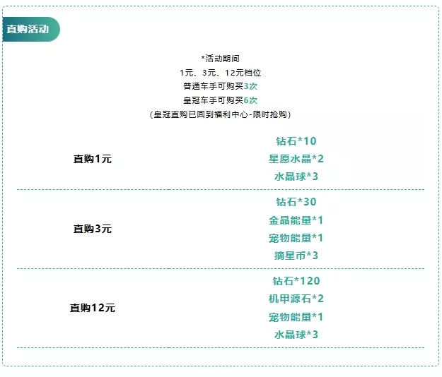 跨月直购活动惊喜开启!8月25日-9月7日,车手们花费1元,即可在9月13日-10月5日的每周周末(周六和周日,共8次)领取绑定钻石,最高累计可获得200绑定钻石!