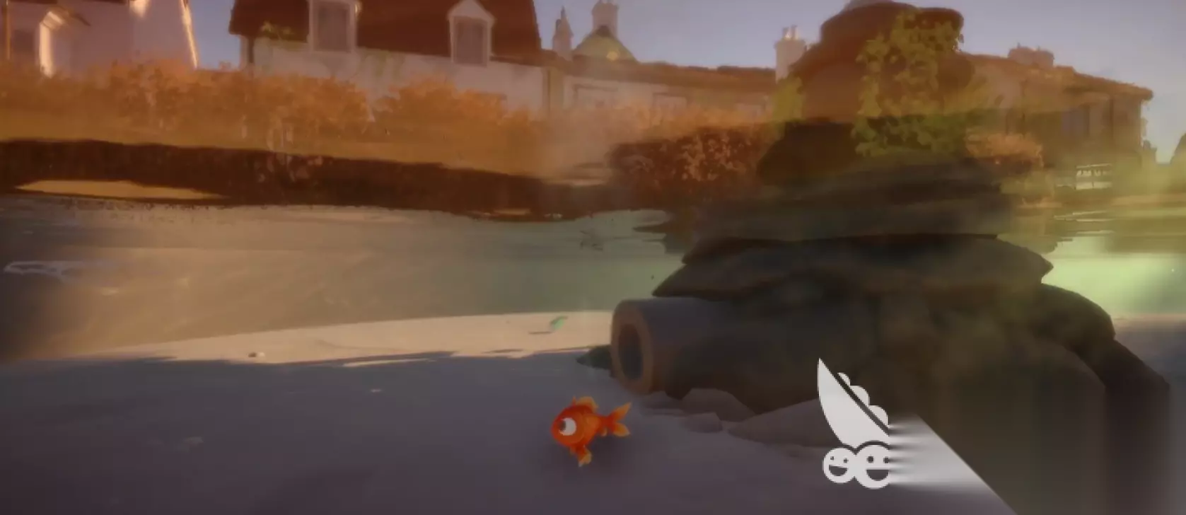 在游戏的一开始,我们会作为一条金鱼,进入到一片水塘里面,在这个池塘里面会有一个面包片,我们需要往相反的方向过去先拿到面包片,才能继续前进。拿到面包片之后,我们朝着别墅的方向游动,然后会发现一个石碓,凑齐看会看见石碓的左下方有一个洞口,我们从这个洞口进入,之后水压便会将我们给弹射到房子上方的水管里面,我们向右边游泳前进。