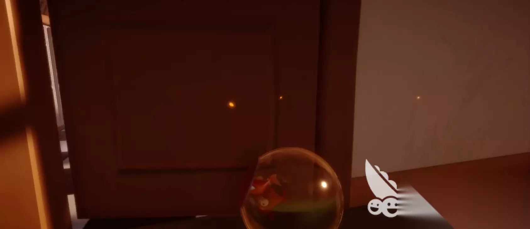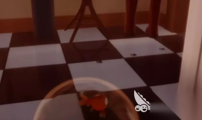 在进入屋里的时候,我们会触发一段剧情,等待剧情过完,我们会进入一个鱼缸,而这时候我们也就可以自由移动了。进入鱼缸之后我们顺着楼梯往一楼下,在二楼的最前方我们会发现一片面包,小伙伴们注意一定要拿了面包再下二楼!下到一楼之后,我们会发现一个虚掩着的门,里头会传来钢琴声,我们进去即可。