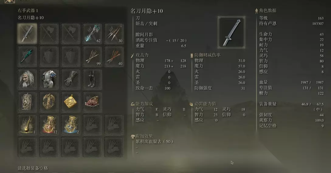 名刀月隐是咱们在交界地冒险时能早期获取的一把强力太刀,特别适合喜欢近战魔法混合流派的玩家。这把武器需要咱们满足力气12、灵巧18、智力23才能发挥全部实力,尤其是智力加成达到B级,战技伤害会随着智力提升显著增强。前期可以按照1:1的比例分配智力和生命值,这样既能保证输出又能提高生存能力。