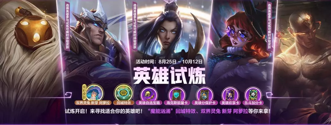 英雄试炼即将来袭,快来寻找适合你的英雄吧~更有回城特效-魔能汹涌、炫彩皮肤-双界灵兔 新芽 阿萝拉等好礼等你来拿!