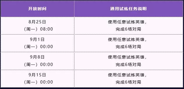活动期间共开放5位英雄供召唤师选择试炼,其中首日即可选择2位英雄进行试炼,之后每周开放1个新的试炼英雄,开放时间公示如下: