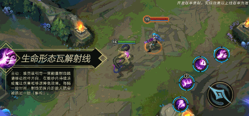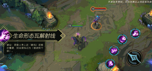 主动:维克兹引导一束能量射线跟随移动摇杆方向,在数秒内持续造成魔法伤害和移速降低效果。每隔一段时间,射线范围内的敌人就会被叠加一层「解构」。