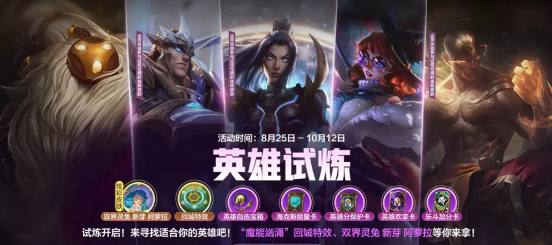 英雄试炼来袭,快来寻找适合你的英雄吧~即日起,截止至10月12日,召唤师完成活动任务即可领取回城特效-魔能汹涌、炫彩皮肤-双界灵兔 新芽 阿萝拉等好礼!