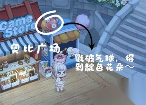 5、靛色花朵:奥比广场的棉花糖机这里,点击戳破小熊气球后可以获得靛色花朵。