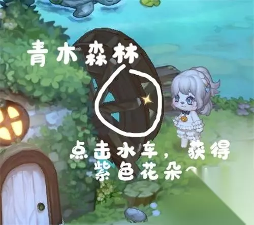 2、紫色花朵:青木森林点击水车,获得紫色花朵。