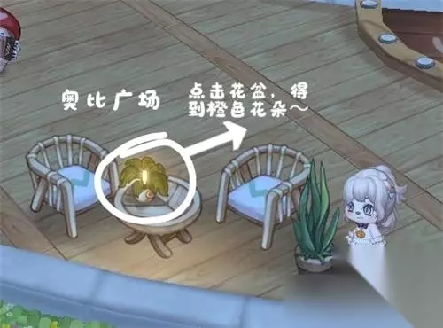 6、橙色花朵:奥比广场左下方的桌椅上,点击桌子上的花盆获得橙色花朵。
