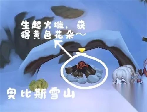 3、黄色花朵:奥比斯雪山这里的火堆生起火之后,即可获得黄色花朵。