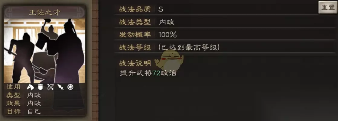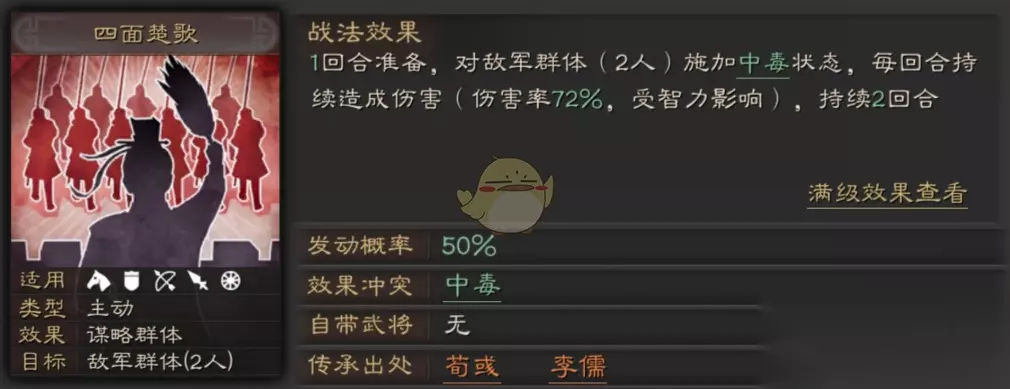 学习战法推荐: 见机行事:提升武将政治属性。(进一步提升政治) 简政:提升武将政治属性。(进一步提升政治) 枯木逢春:委任木材官时,木材屯田收益提升。(提升木材资源收益) 除了这些还可以选择“五谷丰登”、“挖矿精通”、“采石精通”等战法。 可拆战法【主动战法】四面楚歌:1回合准备,对敌军2人施加中毒状态持续2回合。