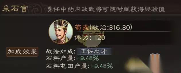2、采石官 委任采石官可以大幅提升石料产量和石料屯田产量加成,石料也是城建里最缺的一种资源,荀彧政治最高,可以选择委任为采石官来提升稀缺资源的产量。