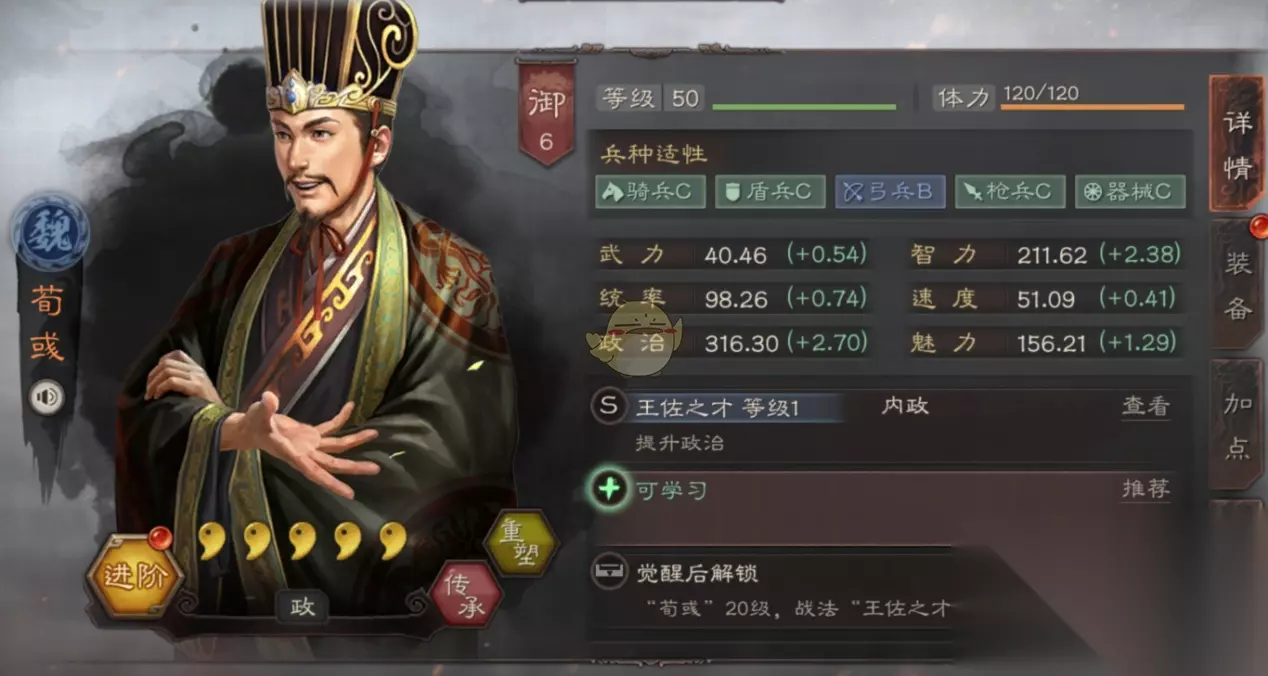 荀彧委任推荐 1、主政官 委任主政官可以大幅提升所有种类的资源和铜币产量,加成效果受到政治属性影响,而荀彧拥有全游戏最高的政治属性,推荐优先选择主政官,因为主政官是所有任职里总资源加成收益最高的一个职位。