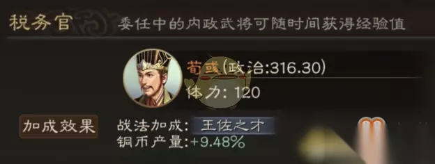 3、税务官 委任税务官可以大幅提升铜币产量,游戏中铜币的用处比较大,但是产出方式较少。荀彧政治最高,选择委任为税务官可以让铜币产量达到最大的加成效果。