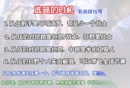 以前的干扰可以有三秒,浪费0.5秒,只是浪费了六分之一。现在干扰只有两秒钟,在进塔的时候浪费哪怕0.5秒,都是非常致命的一件事!建议大家先肉身抗1~2下塔,接着开干扰,然后走出去让塔重新计算仇恨即可。 如果是在大招附身的情况下,可以先从打野身上跳进塔里抗塔,接着干扰,肉身出塔,让防御塔的目标切换成打野。这样是最安全的越塔方式。 为什么要这样呢?因为防御塔攻击同一个目标时,伤害会越来越高,越来越离谱,每次都会追加50%的伤害,最高叠加到第一次伤害的300%,可以说是很恐怖了。 给大家举个例子,假设防御塔初始打100,那么第二次就是150,第三次就是200,第四次就是250。第四次的伤害直接等于前两次的伤害之和,怎么可能不疼呢? 误区四:没有前排硬选瑶 大家都知道,瑶和孙膑、蔡文姬等英雄一样,都是软辅的存在。软辅的特性就是靠功能吃饭,自身的身板并不会很硬。但是每一局游戏,对于队伍的输出、扛伤、控制、带线、守塔等能力都是有一定的要求的。 如果队伍的扛伤能力达不到要求,虽然并不会立刻输掉比赛,但是胜率会显而易见的降低,这一点大家可以结合自身的体验来理解。举个例子,这一局的对抗路是李信,而打野是韩信,两个信在一起,辅助如果选个瑶,这样队伍的容错率会大幅度降低。 换句话说,容错率其实就是获胜的概率。高容错的队伍,就算被团灭一两次,也有获胜的希望,而低容错的队伍,一旦被团灭,也许家就直接没了。所以,在选瑶的时候,建议用这四种逻辑来选。