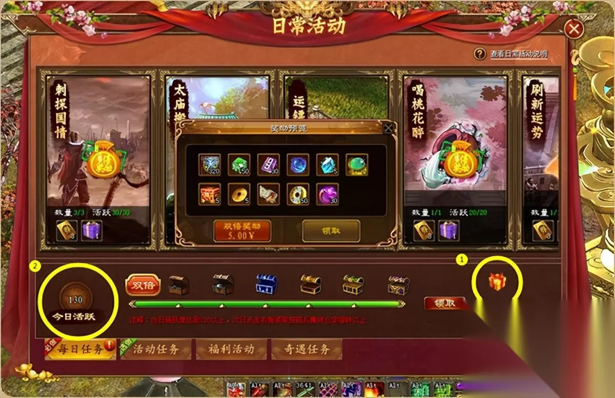 条件1:做活跃玩家,每日清空日常活动。 《征途》日常活动包括每日任务和活动任务两个模块,这些都是与活跃挂钩的。笔者发现,每天把这些做完,基本上就是一个妥妥的活跃玩家啦。 1、 每日任务尽可能全做,至少把120活跃的宝箱奖励领走。现在紫色奇遇宝箱给“任选一键任务卡”,达成120活跃度目标绝对不难。 2、 活动任务必做击杀海妖、点数镖车、缉拿大盗、击杀司马。三生石或者护送龙女也给活跃,但是你把上述这些任务都做了,每日活跃也基本足够了。 笔者认为,在所有任务里面,点数镖车给活跃是最多的。拉不拉点数镖车,直接关系到你是否属于活跃号。当然,如果你的角色已经消费了很多角色点数,即使不拉点数镖车也是国家车的活跃玩家。