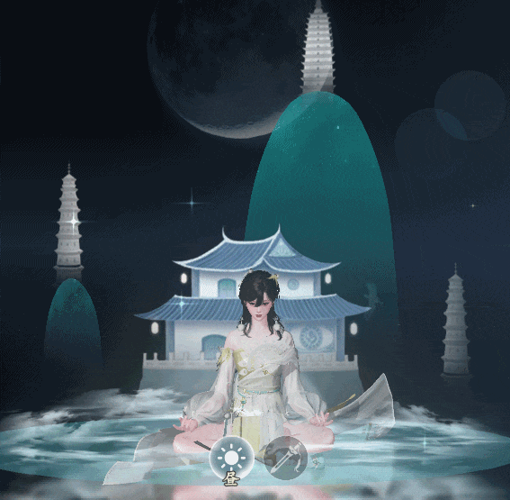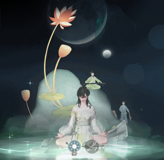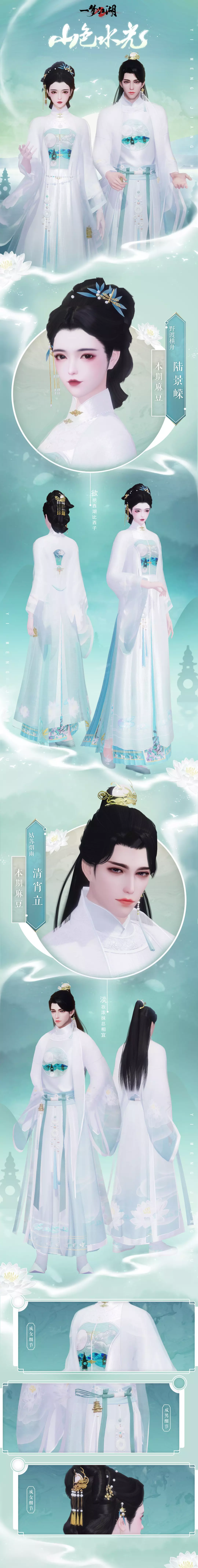 少侠们的胸前和后背图案都参考了三潭印月的月夜湖景,袖口点缀着高洁荷花,刺绣着湖塘月色。衣衫上的湖与岛相得益彰,月与影相守相望。少侠穿上它,举手投足间已然一幅绝美景色。宝髻松松挽就,铅华淡淡妆成。