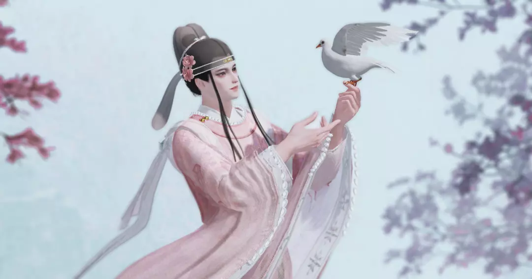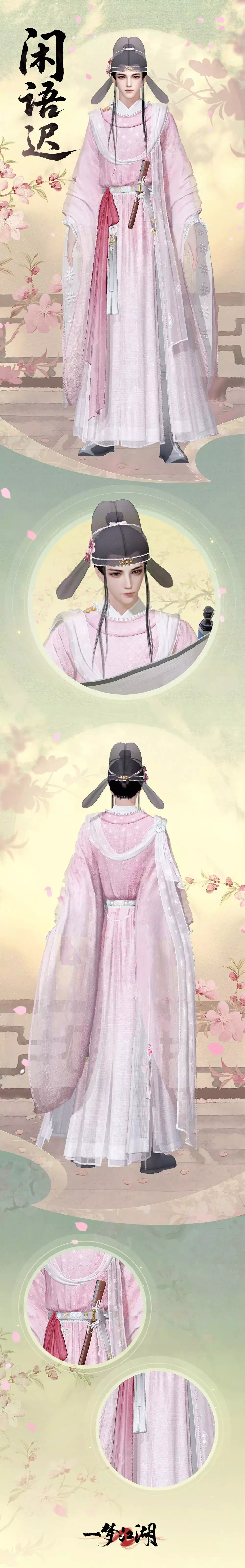 时装·闲语迟纱衣交叠处粉墨氤氲,女款粉白的纱裙层叠,袖间点缀珍珠,腰间粉白香囊系着松石绿流苏,更衬大家闺秀的温婉气质。发间白纱,簪一枝桔梗,意指不变爱意的花语。