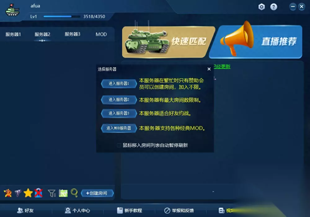 如果不是平台会员,在服务器1跟2是不能自己创建房间的 非会员玩家可以在服务器3创造自己对战房间