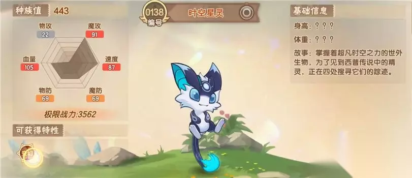 西普大陆精灵图鉴大全 1.时空精灵 这位在精灵之中的编号是138。这个精灵也是近段时间里玩家们提及比较多的一位精灵。这位精灵的种族值是443,虽然没有满,但也是非常高的数值了。它的初始物攻是22,魔攻则是91,速度为87,魔防和物防都是69。血量则是109。 从这个数值上来看,时空精灵主要以魔法输出为主,速度方面不算慢,但是防御都不算特别高。初始的特性是变幻,这个特性是释放技能的时候自身的属性会改变,它的属性会变成和技能对应的属性。时空精灵只要学习的技能属性够多,那么在队长的时候凭借这个特性就可以获取极大的优势。