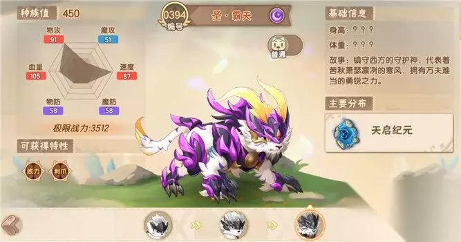 3.圣霸天 这位是暗属性的神兽,本身的种族值高达450。这位玩家们可以在天启纪元之中获取到。本身的物攻是91,魔攻是51,速度是87,双防都是58,血量则是105。总体的数值不算弱。圣霸天的特性有两个,首先第一个特性是底力,这个能力是圣霸天的自身血量低于50%的时候,圣霸天造成的伤害将会增加25%。第二个特性则是爪类的技能威力将会增加15%。