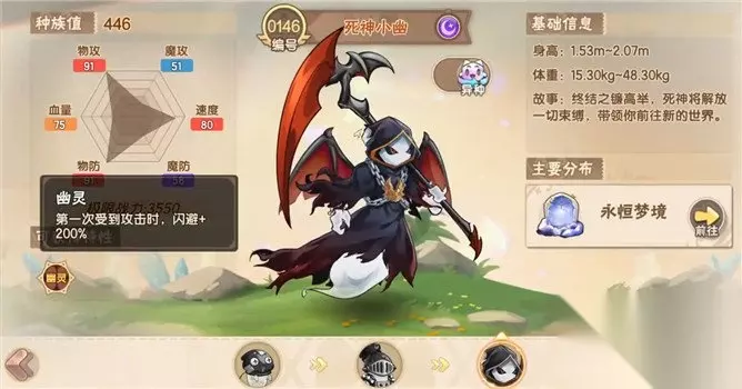 2.死神小幽 接下来介绍的是死神小幽,这位精灵是小幽的终极进化形态,也是目前暗属性精灵之中比较受欢迎的一位。它的种族值是446,非常高的数值。这位玩家们可以在野外进行捕捉,主要的捕捉地是永恒梦境。死神小幽的物攻是91,魔攻则是51,速度是80,魔防是58,物防是91,血量则是只有75。它的特性是第一次受到攻击的时候,死神小幽的闪避值增加200%。