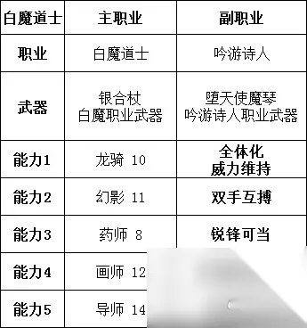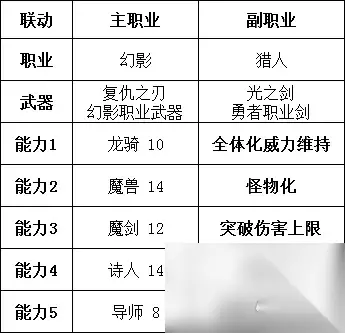 由于需要两把武器相同。而我所需要的其它5个被动完全来自于不同职业。 之所以说这套变通的地方有很多,是因为吟游本身有增加暴击率的技能,如果那个叠满,百分百暴击,则不再拘泥于幻影职业。勇气心眼和提升BP上限就有了空位。 如果切换成卫士这种给予更高攻击力的职业,则不再需要拘泥于野性化和怪物化。