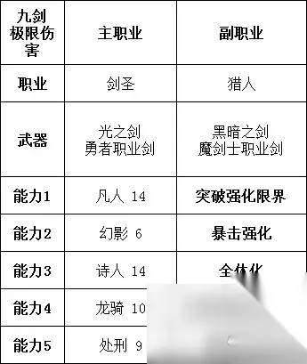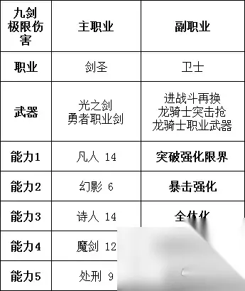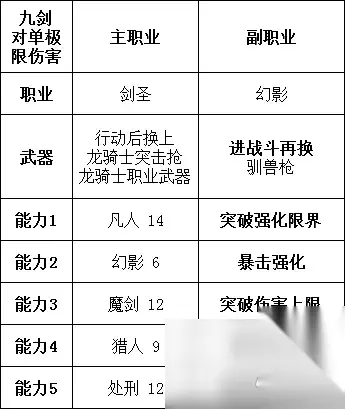 在这套配置里,我的攻击力还是只有600左右,所以,我将不稳定的勇冠三军换下,装备了3发奋勇提升50%面板攻击力的怪物化。 今天拍了个小视频,就是这套双枪剑圣流。坦白来说,这套我觉得还有改进空间,但是我想不出来了。(由于幻影特征2使特征1百分百生效的原因,导致勇气心眼这个天赋无用了。4月1日发现的,可以调整一下构筑) 九重剑气是段数最多的伤害,只要提升到极致,那么它们合并在一起的伤害一定会高于单发99999的技能。如何尽量提高每段的伤害,就是我们必须要考虑的了。 我想到的最直接的提升方法,就是暴击和暴击增伤。也就是再度利用幻影的直击要害。 剑圣本身物攻S,又自然省去副职业1、副职业2,于是幻影副职业成为了必须。 想起暴击率和暴击增伤,直接想到的技能就是幻影的 暴击强化,还有进一步增加暴击率的勇气心眼。不过勇气心眼发动条件在BP≥1的情况下,才能使暴击率进一步增高。3点BP下降之后为0,如果只下降2点,无法触发怪物化。 那么我们选择增加BP上限。灌BP交给药师。 既然是极限伤害,那么一定要让吟游诗人的物理强化,突破强化界限(凡人)。而创造敌人弱点的工作,交给预言者(附魔以及弱点附加)。 再加上魔剑的突破伤害上限就大功告成了。攻击力正好可以略微高于555。在驯兽枪的强化下,可以达到999。为了避免乱序,则在剑圣行动时再把两把枪换上。