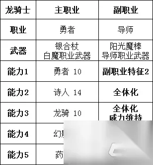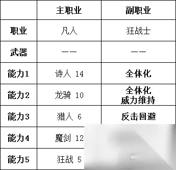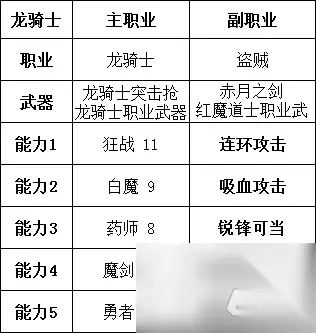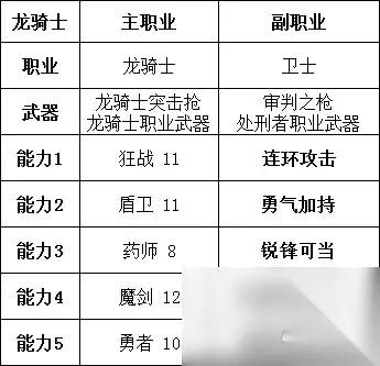 增加暴击添加,是为了发挥一点勇冠三军的伤害。 如果担心属性不纯,则可以将龙骑枪换为黑暗剑,然后将突破伤害上限切换为全体化威力维持。这时暴击添加就没什么用了。在这个时候,相当于废了勇冠三军这个技能。就随便搭配一个吧。例如反击回避什么的。 当你用馒头喂满了攻击力属性时。则可以将卫士、凡人这类纯提高属性的副职业换掉。 切换成副职业猎人。