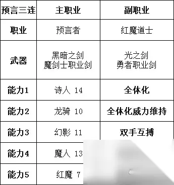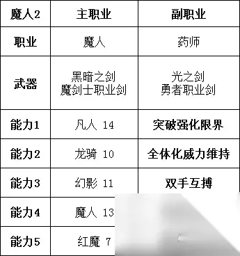 核心为:一切全体化、突破伤害上限,HP/MP转换,其他随便配。舍身一击也很重要,避免对面闪避,稳定的99999固定伤害,就是自己也会仅剩1血。最终BOSS我就是5个究极神剑带走的。 能力3/4/5,主要是为了配合后续的差额剑,两发全体19997,也算补足伤害了。总之很猛。 最后再来个法师。 法师的搭配无外乎红魔道士、魔人、预言者的两两结合。因为是进攻弱点,所以黑魔道士的绝对魔法就没用了。遇到个别全抗性的敌人,建议还是走物理路线或固定伤害路线。 更有个别很讨厌的敌人,是魔法打了多少血,就会自动恢复多少血。这种连绝对魔法都没法处理。职业突破时,与勇者在一起的黑魔道士就是这种类型的敌人。