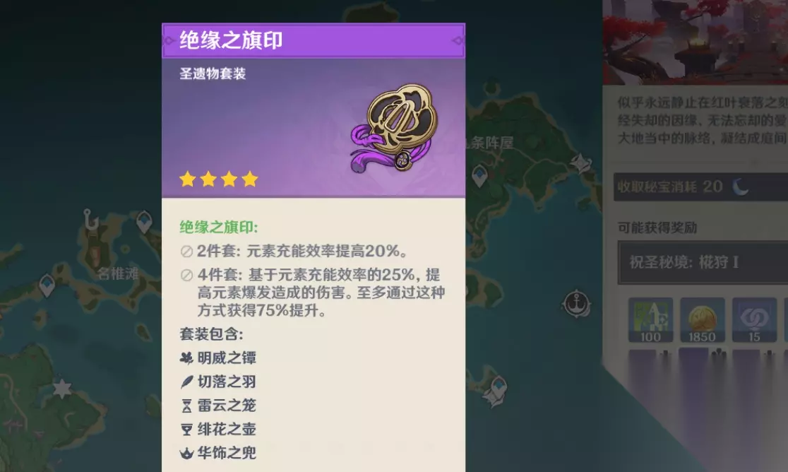 原神的绝缘套圣遗物的正式名字叫做绝缘之旗印,2件套装的作用是元素充能效果提升20%。4件套是基于元素充能的25%,提高角色元素爆发造成的伤害,并且能通过这种方式提高75%的伤害。绝缘套基于套装效果提升的元素充能效率和元素爆发伤害是很多角色适用的,原神中不同的属性效果的圣遗物套装所刷取的位置是不同的秘境,大家可以根据自己角色的定位刷取不同的套装。 在准备阶段,玩家应优先选择适合刷取绝缘之旗印的角色阵容。推荐使用能够快速清理怪物并具备一定生存能力的角色,如高爆发输出型角色搭配群体治疗或者支援型角色,但是大家最好不要带雷属性角色,因为绝缘套秘境里面的怪物有雷属性的史莱姆会免疫雷属性伤害,雷属性的丘丘王雷抗也很高,很难用雷伤去打,雷深渊法师的盾也不能用雷破除,所以更加推荐大家使用能和雷元素反应的元素,比如冰火水草。最后要装备上自己目前已有的强力武器和圣遗物,以确保能够快速通过战斗。