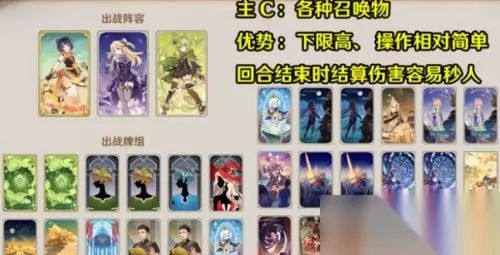 NO.5 召唤流卡组 适合萌新玩,说白了就是下限极高。你只需要记住一件事,火雷草三种,缺了哪个召唤物,你就补哪个。至于卡组上限,就取决于玩家的算计,以及发牌员的配合了。勿死板的硬放召唤物,在猜测到对方可能一波带走你时,选择性切人抗伤,少一个召唤物总比少一个角色好。