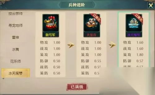 除了兵种的转职,还可以进阶强化兵种,强化需要材料,根据你想要的兵种强化所需要的材料进阶,强化的材料可以去精英副本中获取,也可以购买,一步步强化到最强的兵种,到一定等级还可以挂帅出征,有一支精锐部队,让你的部队越来越强大,各位主公们,一定要记住各兵种不同等级的属性加成也是不一样,兵种之间也是相互克制,还有不同站位的兵种可以说有着完全不同的战术价值,赶快去战火纷飞的三国战场上了留下了属于自己的铁血战史吧!