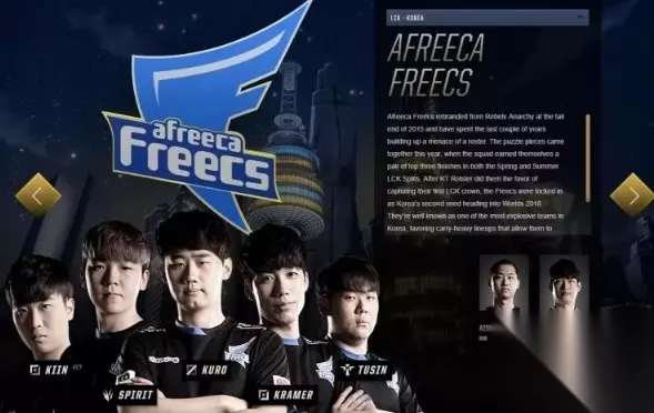 Samsung Galaxy(简称SSG)是一支来自韩国的职业电子竞技队伍,成立于2000年,该战队的前身为Samsung KHAN,2013年9月10日改为现名。过往战队归属于KeSPA,并由三星电子赞助。现已被KSV eSports收购,并易名为Gen.G Esports。(简称Gen.G) 该战队的英雄联盟分部曾拥有Samsung Galaxy Blue(SSB)和Samsung Galaxy White(SSW)两支队伍,其中Samsung Galaxy White曾在英雄联盟2014赛季全球总决赛中获得冠军。2014年,由于Riot Games规定每个俱乐部只能拥有一支战队,使得该俱乐部将两者重组为Samsung Galaxy。[2]2017年,SSG在英雄联盟2017赛季全球总决赛的决赛中以3:0击败冠军大热门SK Telecom T1,获得冠军。 点击查看队员介绍 Afreeca Freecs