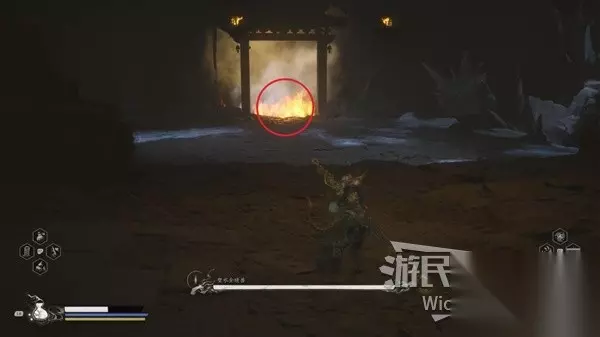 来到第二个战斗场地可以看到第二次与璧水金睛兽战斗场地的前方被一团火挡住,而璧水金睛兽的第二心态是冰形态的,我们要模仿第一形态那样站在下图画圈的位置,一直躲避璧水金睛兽的技能,等待一个冰形态的吐息浇灭火焰继续沿路走到达下一个场景触发第三形态。