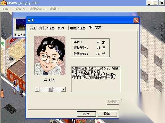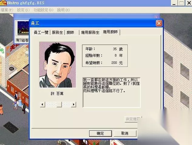 接下来是徐百万,年龄35岁,拥有八年的厨师经验,他期望的时薪为200元。他的专长是各类米饭菜肴,而对于肉类料理则不太擅长。考虑到在游戏一开始,餐厅位置较差,客人的收入有限,因此提供普通的米饭菜肴是最明智的选择,雇佣徐百万将毫无问题。