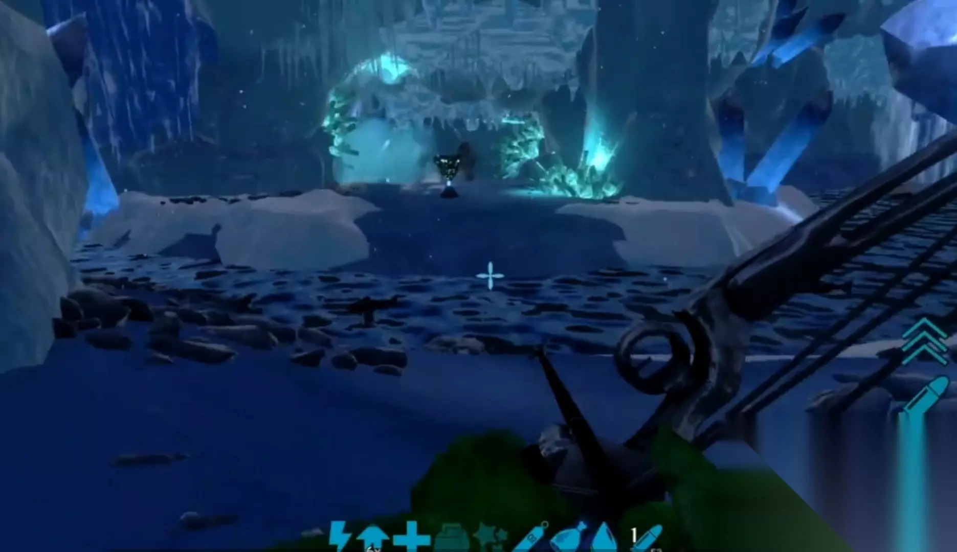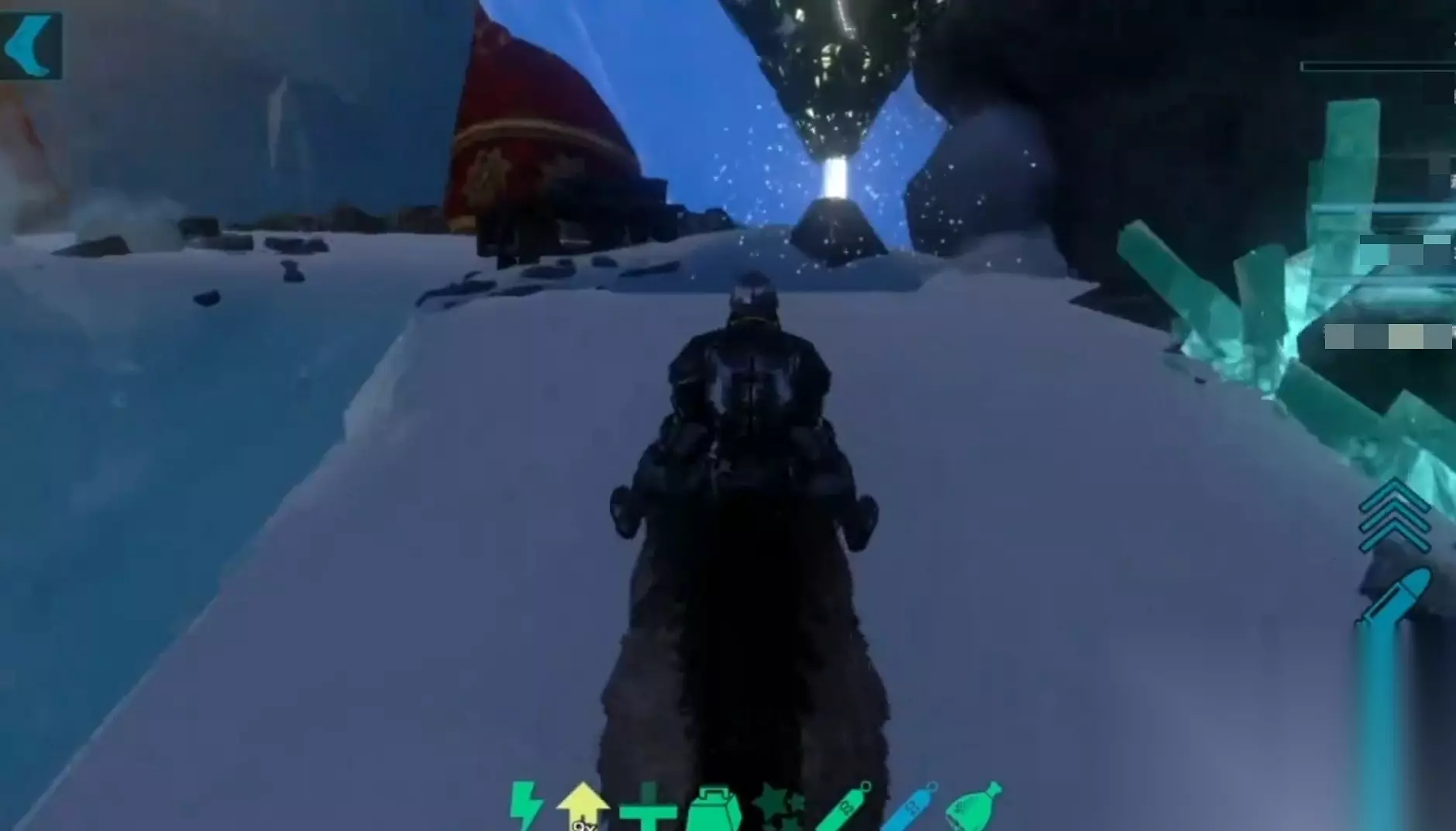 之后继续过河走左边的路,我们会看到一片冰湖,你可以选择走浮冰过去(不推荐),也可以在左侧建造个梯子、桥之类的。走梯子上去,把堵路的水晶敲掉,顺着路一直走,有宝箱的刷新点,这条路的尽头将会是一大群怪。