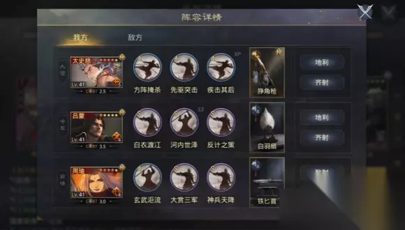 吕蒙可以携带反计之策和绝水遏敌战法,通过控制敌军的行动来为队伍创造输出机会,且它还要吸引对面的火力攻击,所以自己的防御力不能过低。周瑜携带神兵天降和大赏三军战法,为队伍提供增伤效果,进一步提升SP太史慈的输出能力。这种搭配可以形成一套快速击溃敌军的战术体系,在速推副本里面有很大的优势,但sp太史慈不是那么好获取的,如果你只是普通的太史慈的话,那么我们就要发挥它的控制效果,在搭配一些增加输出和生存能力的战法使用。常见的组合是太史慈搭配张辽和曹操,当太史慈可以携带怯心夺智和疾击其后,利用其单体输出能力和控制效果对敌军造成重大打击。张辽选择攻其不备和长兵方阵,曹操携带一夫当关和单骑救主,增强队伍的生存能力,确保在战斗中能够持续输出。