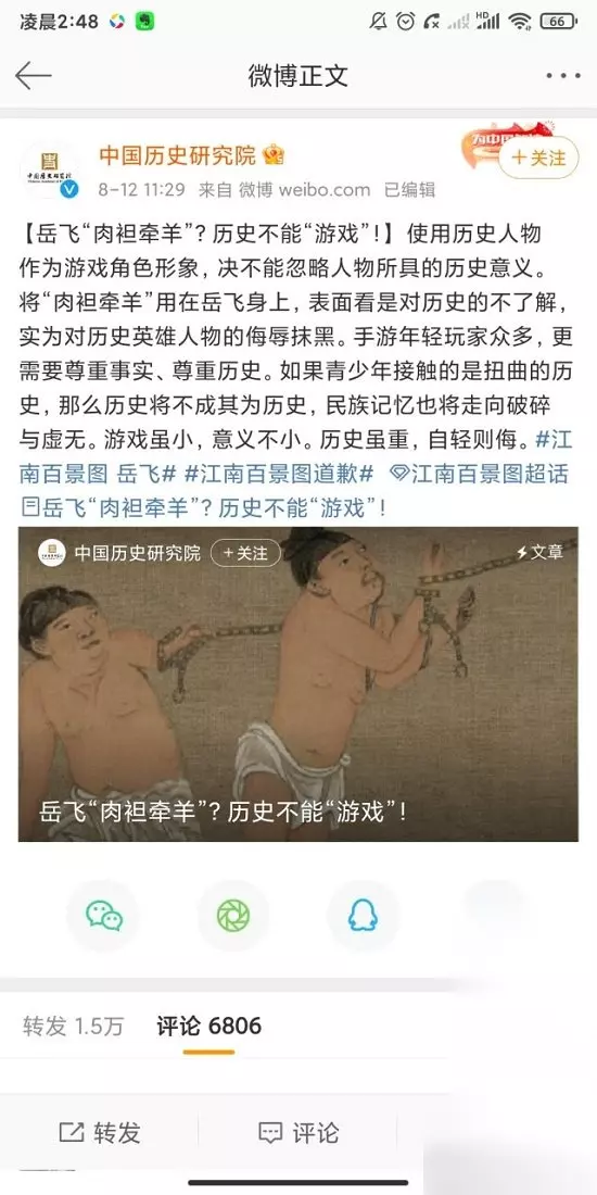 而岳飞作为抗金英雄,这样的图案设计实在是对英雄的一种侮辱轻蔑。对此,我国历史文化研究院也发表了看法,痛斥江南百景图这种“游戏历史”的行为。 在舆论的压力下,江南百景图重新绘制了岳飞的人物形象,这件事终于落下了帷幕。但这件事带来的影响就真的结束了吗?并没有。