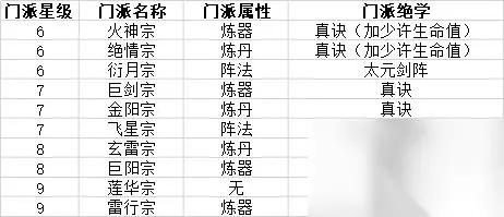 注意: 1. 隐世门派并没有小周天阵,只有两个门派有阵法。衍月的阵法等级是6品,飞星是7品,也就是说,5品及5品以下的阵法师可以去衍月继续提高阵法熟练度,6品及6品以下可以去飞星。如果阵法已经是7品以上,只能等玄仙再进入10星门派学习阵法了。 2.大部分隐世门派的绝学是真诀,6星大概加1800血(6级),聊胜于无。 3.隐世门派的攻防属性,和普通的6-9星门派攻防属性是一样的。 玄仙境界可以进入9个10星门派,叛教声望是100万一次。以下是门派列表。